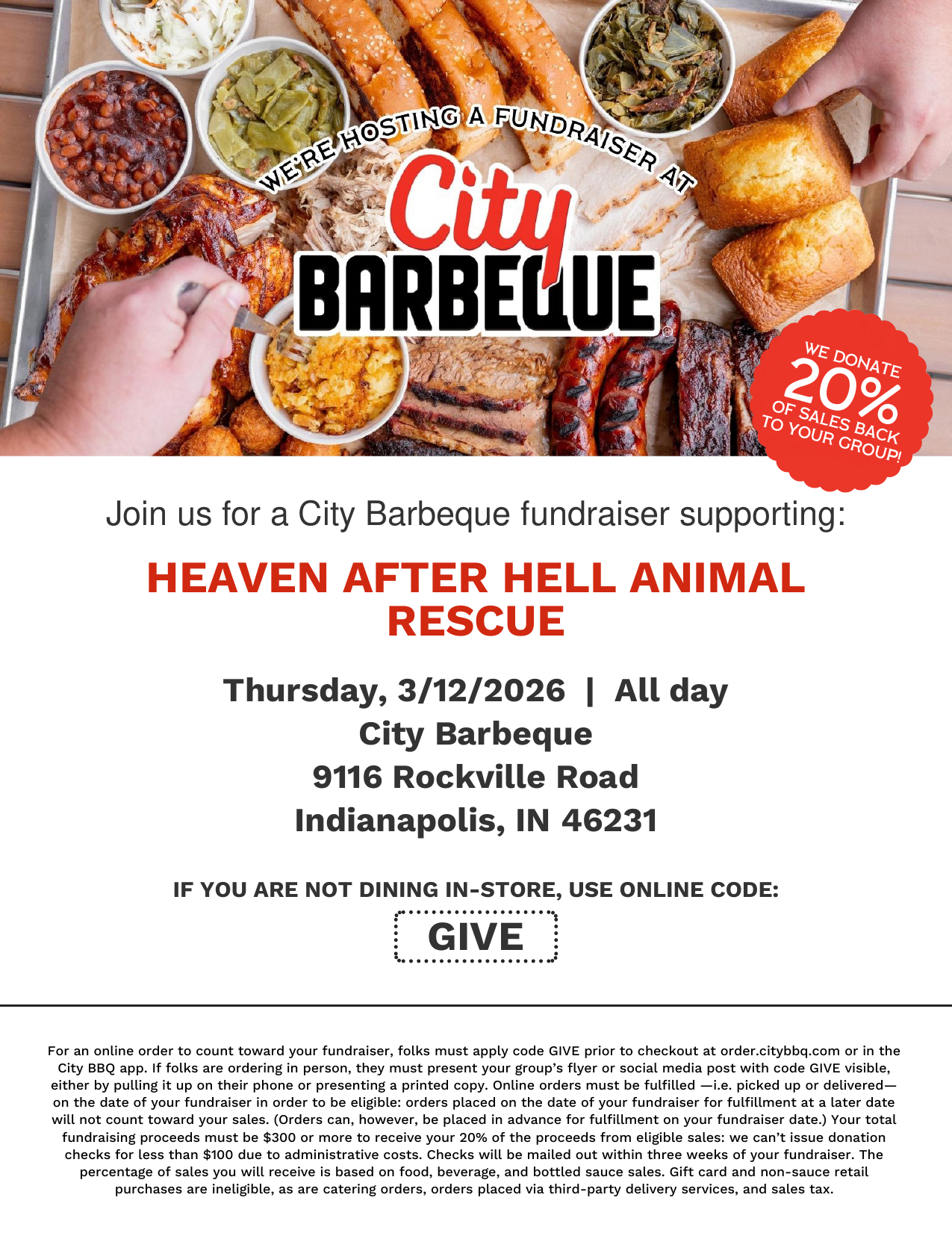 Join us for a City Barbeque fundraiser supporting Heaven After Hell Animal Rescue. City Barbeque will donate 20% of sales back to our group. If ordering online, use code: GIVE.