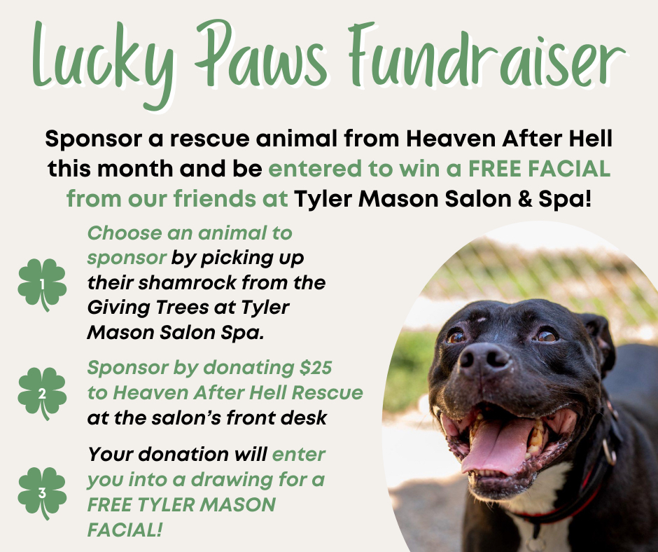 Sponsor a rescue animal from Heaven After Hell this month and be entered to win a FREE facial from our friends at Tyler Mason Salon & Spa.